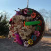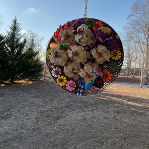 ADORNED WITH WOOD BALLS, BEADS, PLASTIC WHEEL DISKS, PLASTIC TUBES, AND ZIGZAG PALM SHREDDER, VEG TANNED LEATHER, FINGER TRAPS AND PAPER STRAWS.